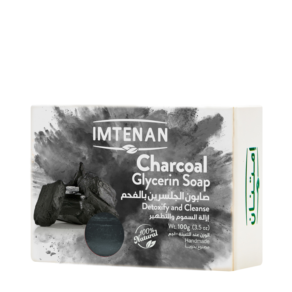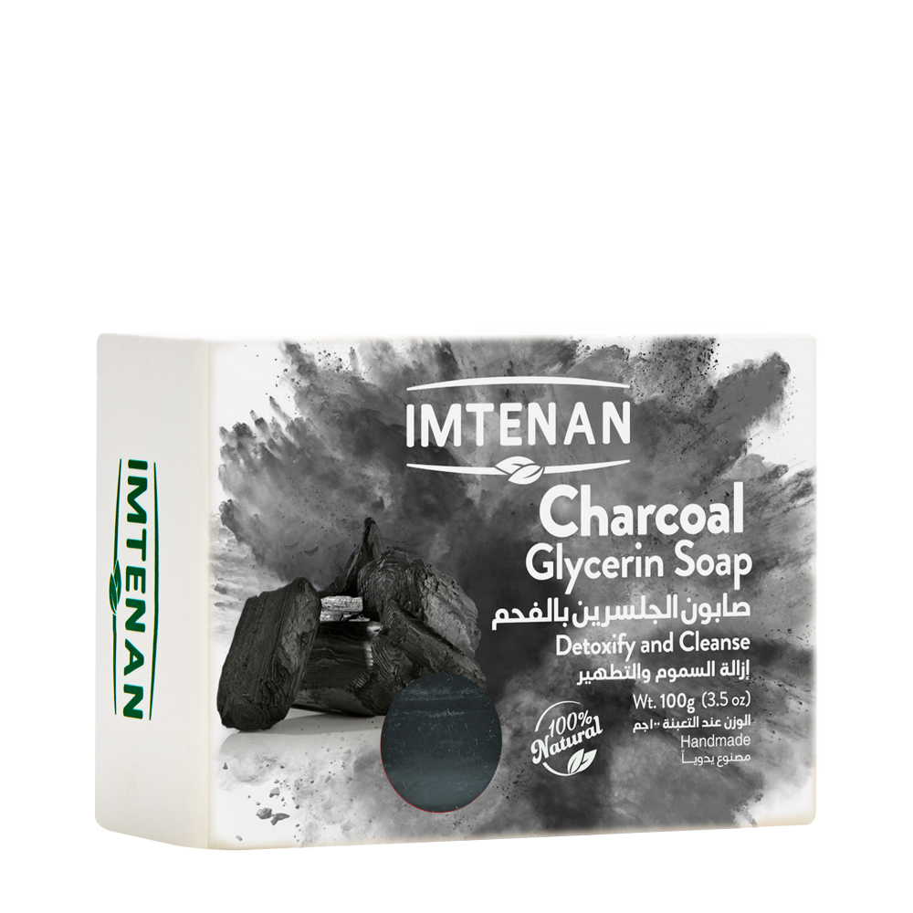 Glycerin soap with 100% natural charcoal from Imtenan made with activated charcoal that helps remove toxins and unclog pores, which reduces acne appearance and is very gentle, making it ideal for sensitive skin