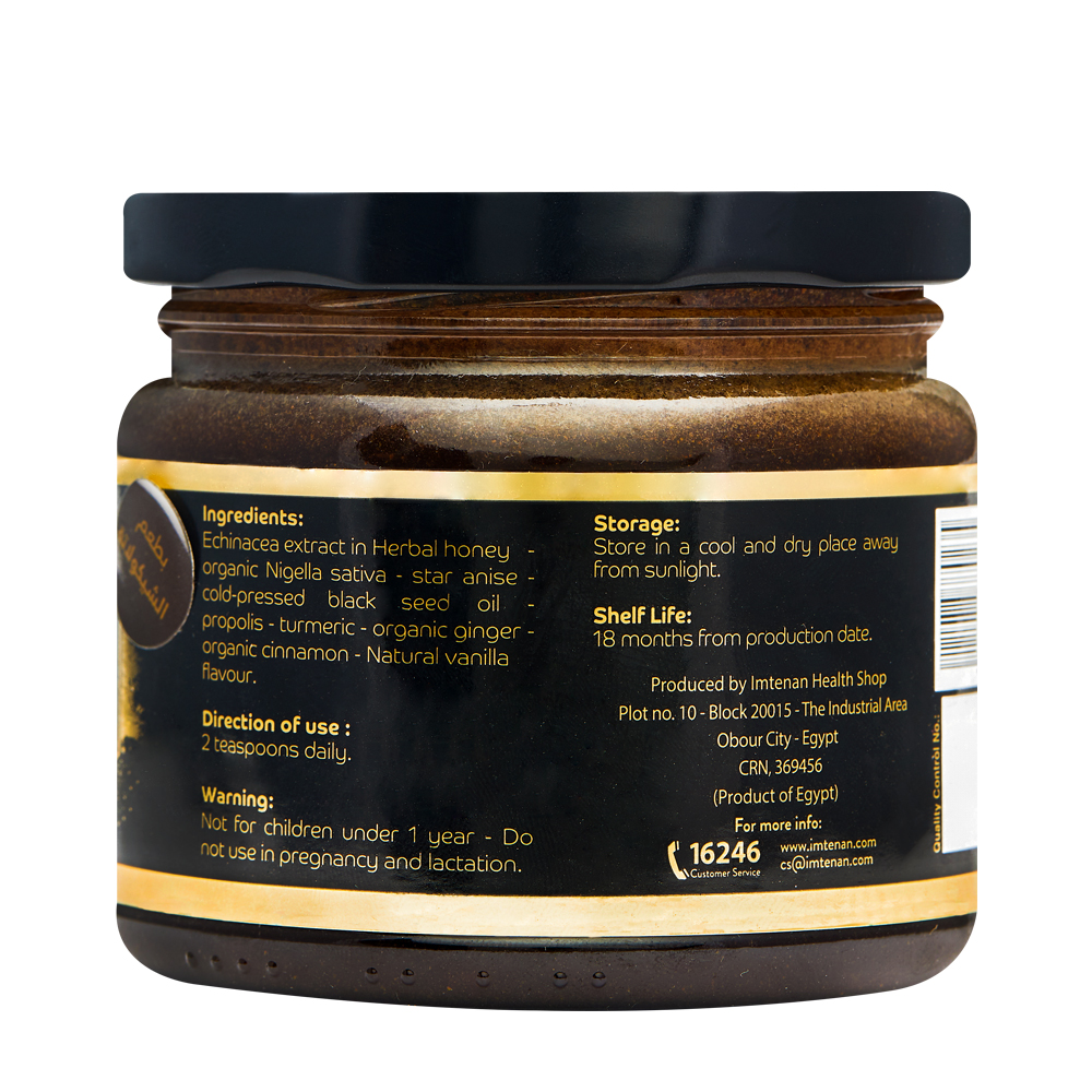 Echinacea Honey – Organic Black Seed – Star Anise – Cold-Pressed Black Seed Oil – Propolis – Turmeric – Organic Ginger – Organic Cinnamon – Vanilla Oil – Cocoa – Chocolate