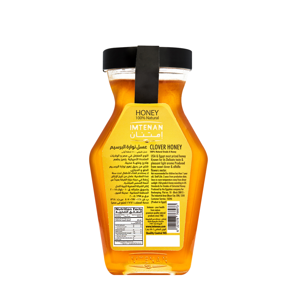 Description : It has a mild taste and a pleasant floral flavor. Benefits : Clover honey is one of the most widely consumed types of honey in the world. It has a mild taste, a light amber color, and a pleasant floral flavor. It has a moderate viscosity, making it gentle on the stomach. It is also suitable for those suffering from digestive inflammation and constipation. It helps soothe coughs and dissolve phlegm. Warnings : All types of honey may crystallize naturally over time, but this does not affect its quality in any way. By carefully heating the honey, these crystals will dissolve. Honey should not be used as food for children under one year old. Honey should be used with caution and according to doctors' instructions for diabetic patients, with a daily dose not exceeding 20g (3 teaspoons). Honey is acidic, so it should be tested first if the patient suffers from stomach acidity. Some people may have allergies to honey and bee products, so it is important to taste and test the products before purchasing. If used topically for wounds, burns, or ulcers, a doctor's approval is required. Usages & Dosages : Use up to a maximum of 60g per day, and for diabetics, 20g per day. |